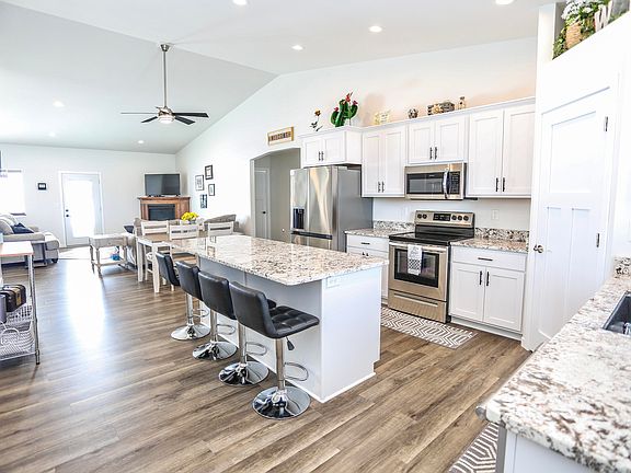 Just Like NEW! Clean, Open & Bright! Built in 2022 this ZERO entry home has 3 bedrooms / 2 bathrooms. Including a Primary Suite with double closets + double sinks + walk-in shower. Vaulted Ceiling over the living, kitchen and dining carries an inviting layout. Living room features a walnut-finished fireplace + entrance to covered back patio. Graceful touches and function continue to the kitchen with an almost 8ft Granite Topped Island. Ample cabinetry offers a spot for everything - with additional island storage & pantry. The Laundry room has a sink + bench and opens to the attached / double garage. Its all here! Call your Realtor today for more details and to schedule your private showing!