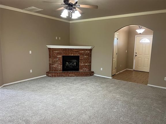 Enjoy a living room with cozy corner fireplace with plenty of space for a TV or art on top, crown molding, and a ceiling fan which opens up to the spacious eat-in kitchen. You'll love the dark wood cabinets, solid surface countertops, and stainless steel appliances. The glass top electric range, dishwasher, and refrigerator are included! This kitchen also boasts ample work lighting and a pantry. The breakfast nook has room for a good-sized table and includes a built-in desk area to keep you organized. An indoor utility room with a sink is just off the kitchen. This house has a primary suite that can easily accommodate a king-sized bed with room to spare for a desk or reading nook. The master bath has a corner garden tub and separate his-and-hers vanities, perfect for your morning routine and to wind down after a long day. You also have a tiled walk-in shower and large walk-in closet. This house has ceiling fans in all three bedrooms and a warm neutral pallet throughout to compliment most any decor. Don't miss the attached 2 car garage with in-ground storm shelter to keep your family safe and large backyard with covered patio and privacy fence. There is access to the patio from the dining area and master bedroom.