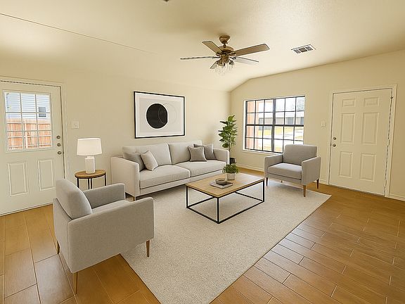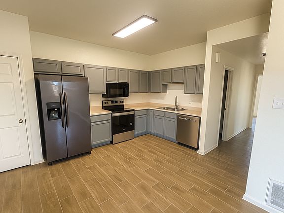 Step inside to an open-concept living area filled with natural light, durable wood-look tile flooring, and a modern ceiling fan fixture that adds both style and comfort. The spacious kitchen features sleek gray cabinetry, stainless-steel appliances, and ample countertop space perfect for cooking or entertaining.