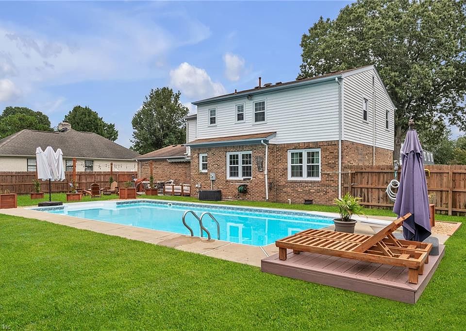 Stratford Chase Gem in the Heart of Kempsville! This beautifully maintained 4-bed, 2.5-bath home offers over 2,200 sq. ft. on a quiet cul-de-sac with a 1/3-acre lot. Enjoy an updated kitchen with granite counters, stainless appliances, and walk-in pantry, plus formal dining, spacious living room, and cozy family room with gas fireplace. Upstairs features four oversized bedrooms and two full baths. The backyard is an entertainer’s dream with an 18’x36’ in-ground pool, patio with SunSetter awning, fire pit, gas hookup for grilling, shed, and lush landscaping with mature blueberry bushes. Upgrades include new energy-efficient windows (2024–25), tankless water heater, two-zone HVAC, and updated ductwork. Two-car garage, driveway for six, all appliances convey as-is, and a one-year home warranty is included. Don’t miss this rare Stratford Chase beauty—schedule your tour today!