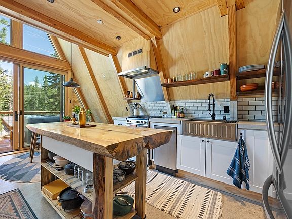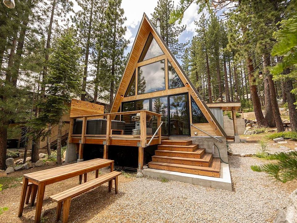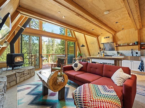 Your modern mountain retreat. Newly built A-frame captures mountain simplicity and comfort. Meticulously crafted by the owner builder, all the wood and stone finish was repurposed from the property. You will appreciate the design of clean lines and maximum use of space. The entry level has hard wood floors throughout and the mudroom presents nooks for your mountain gear. The upstairs bedroom optimizes the light with large windows overlooking the great room, and has a full adjacent bathroom. Don’t miss the ships ladder to the cozy loft. The hand sawn spiral stair case leads you to the lower level. Here you will find the great room, office/ guest room, a second bathroom, laundry, and indoor and outdoor storage and work bench. The great room features an impressive stone hearth and bench, with a wood burning fireplace, which provides sufficient ambient heat. The concrete floor on the main level retains heat during the winter and keeps it cool in the summer. The kitchen features stainless appliances, railway station tile backsplash and a custom-made wooden island. The full glass south facing wall, welcomes in the natural light and outdoors. Enjoy entertaining and outdoor ambience on the raised, sunny deck, with a hot tub, overlooking a private, landscaped yard, backing to the greenbelt. The heated entry step allows for easy access and the driveway can accommodate multiple cars. The on-demand water heater, hydronic wall heaters, high rated insulation and dual pane glass are all energy efficient features for modern mountain comfort. Tucked-in at the end of the neighborhood, with close access to the community trails and homeowner’s private beach on the Yuba River. Enjoy this prime location at the gateway to the Sierras, with easy access to highway 80. Donner Summit is renowned for all it has to offer; adventure freely in the summer time with hiking and biking in the forests, rock climbing mountains and swimming in pristine alpine lakes. In the winter it transforms into a playground of world class ski resorts, alpine and cross-country skiing, snow mobiling, ice skating, and crisp starlit snow shoe walks. HOA includes water, sewer, road maintenance and snow removal.