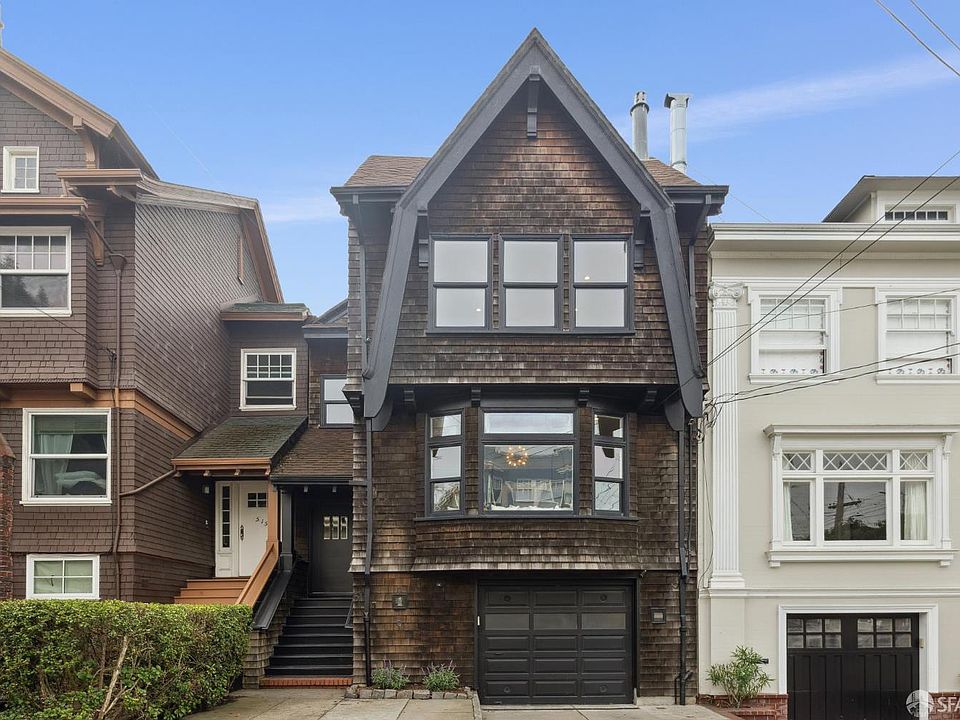 Elegant Inner Richmond Edwardian! A handsome wood-shingle faade introduces an interior that gracefully blends timeless detail with modern upgrades. The gracious wainscoted entry leads to a sunlit open living room with a charming window bench, abundant natural light, and a gas fireplace with marble surround. The sophisticated dining room showcases box-beam ceilings, intricate moldings, wood paneling, hardwood floors, and a built-in china cabinet. A recently remodeled chef's kitchen with quartz countertops, stylish backsplash, and deluxe stainless appliances opens directly to a large wraparound deck, ideal for BBQing and entertaining, with stairs down to a grassy, manicured lawn and palm tree. Upstairs are 3 bedrooms and 2 baths, including a generous primary suite with a wall of closets and an updated ensuite bath with colorful glass tile shower. Two more bedrooms enjoy great light and ample closets, sharing an attractive hall bath with a shower over tub. In-unit laundry and a spacious unfinished attic add convenience and storage. The lower level offers a versatile office and flex room with direct garden access, a roomy one-car garage, add'l storage and 2 off-street parking spaces. Just 3 blocks from Golden Gate Park and 2 blocks from Clement Street's fantastic shops and dining.