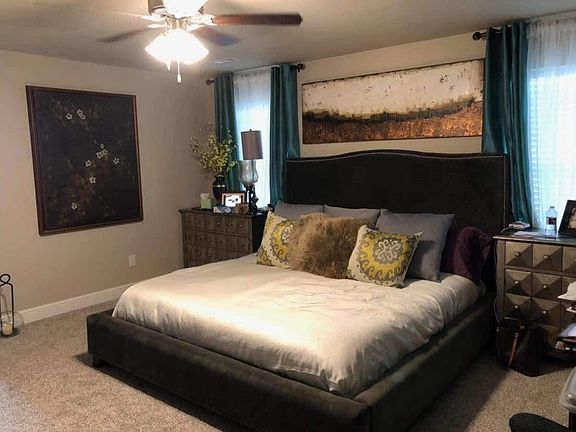 Welcome to your next home! This stunning three bedroom, two bathroom features a timeless brick exterior and beautiful park like landscaped front and back yards. Upon entry, the home features 10-foot ceilings in the living and kitchen areas, which create a spacious, inviting atmosphere. Electric fireplace in the living room, a large master suite, complete with separate His and Hers closets, separate shower and large tub combination. Additionally the home features beautiful granite throughout, spacious bedrooms, in-ceiling sound system, generously sized 2-car garage, attic and expansive landscaped backyard complete with an extended patio featuring a built-in bar and outdoor fireplace As a safety feature, you will have complete peace of mind with the the 6 person storm shelter this home includes. Home has been professionally cleaned and it's ready. For you to move in. Don't miss out on this incredible opportunity to live in a beautifully appointed home in a fantastic neighborhood. $250 non refundable pet fee per dog. Non smoking home Subject to HOA rules. Trash Cans stowed inside left side of home behind fence. Utilities and yard care are the tenant's responsibility.