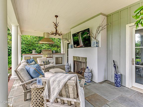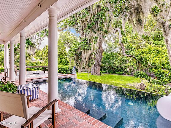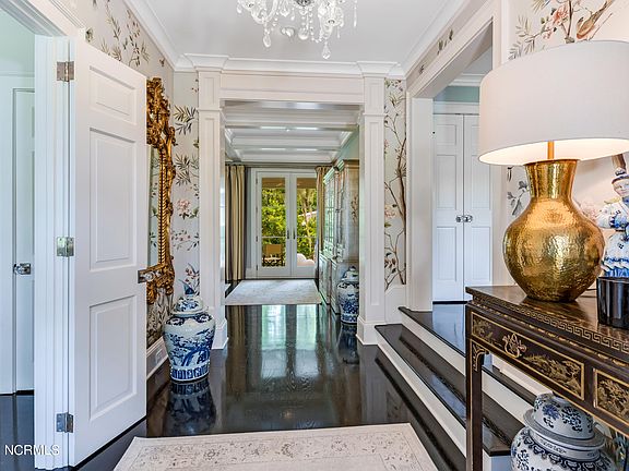 A timeless luxury home in a priceless setting off Airlie Road. Every detail of the house and landscape was thoughtfully designed in its full renovation in 2015. The elegant ambiance of this property is truly one of a kind. Custom features adorn every room including elegant black wood floors, layered moldings, and stunning light fixtures. A chef's kitchen complete with custom cabinetry to the ceiling with lighted glass display accents and top of the line appliances. Glamorous black lacquer butler's pantry with lighted glass front cabinets. Whole house lighting and sound systems create the perfect atmosphere for relaxing and entertaining. The owner's wing is a grand retreat with his and hers custom closets and a luxurious en suite. The living room is lined with beautiful glass doors leading to the true highlight of the home; the outdoor living space. The backyard is a private, southern paradise featuring a handmade infinity pool surrounded by a patio perfect for dining and entertaining. A finished two car garage with a charming guest suite and outdoor living room, gas fireplace, and grill area overlook the serene waterfall of the pool. The entire property exudes a soothing atmosphere set amongst live oaks draped in Spanish moss. Salt air breezes from the ICWW and Bradley Creek put the cherry on top of this perfect southern coastal setting.