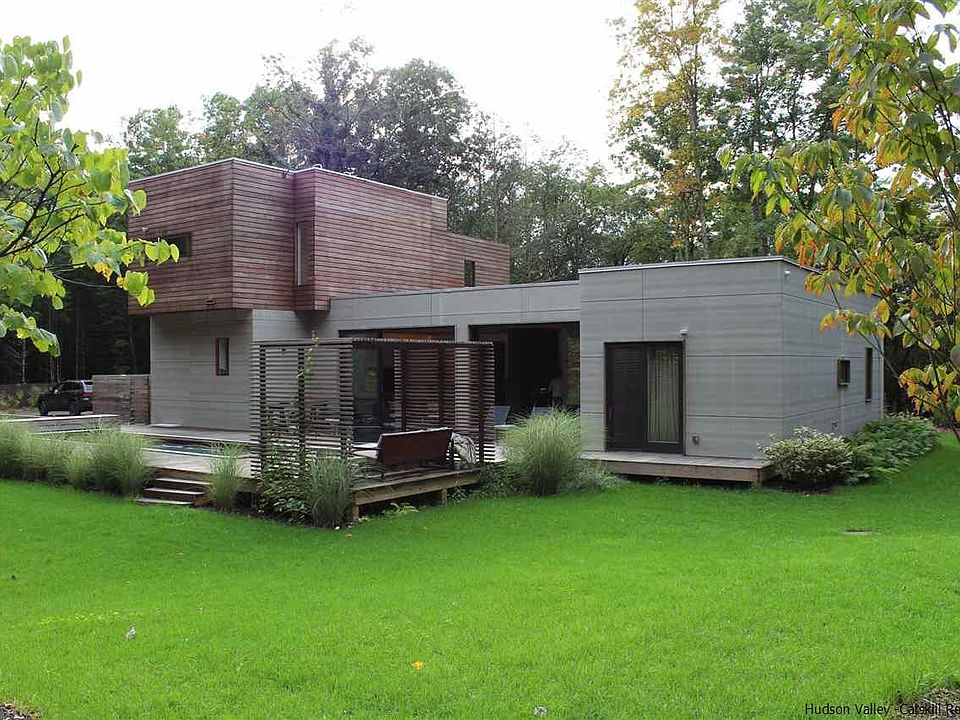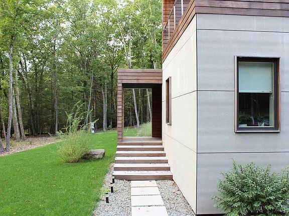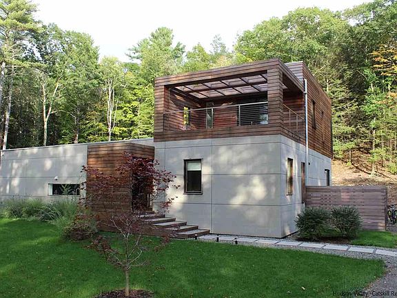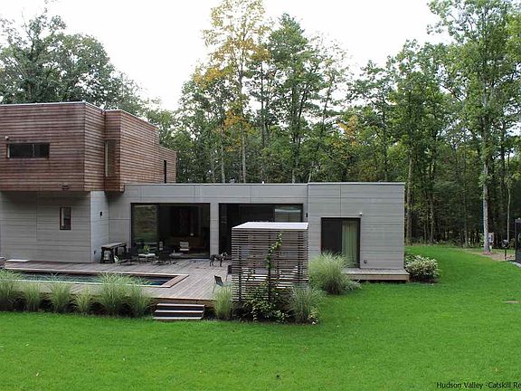 This gorgeous, newly built contemporary home sits on 10 private wooded acres and is bathed in natural light from the large beautiful windows and doors. The sleek exterior is constructed with Ipe wood and Minerit siding which compliments the contemporary design and assures low maintainence. Entertaining is a pleasure both indoors and out - enjoy the gas fireplace in the living room, gorgeous well appointed kitchen or move outdoors to the large deck and heated ICF 10' wide x 30' long pool. The second floor master suite boasts a luxurious bath and private deck - great for early morning coffee or late day sunset views. The main level includes two additional bedrooms and 1.5 baths, gym, sauna, office and meditation room. A fenced garden for vegetables is conveniently located close to the kitchen. Enjoy hiking on your ten very private wooded acres! A view of High Point can be accomplished with selected clearing. Just minutes from the Ashokan Reservoir, convenient to Stone Ridge, High Falls and Woodstock.