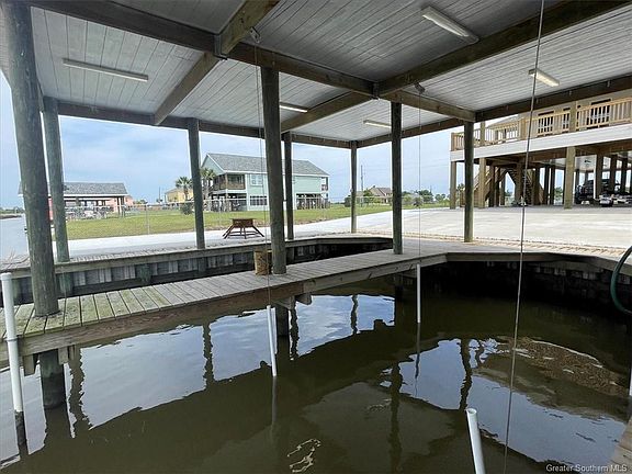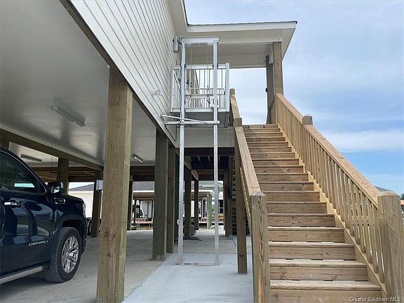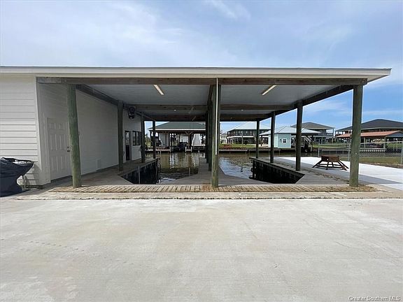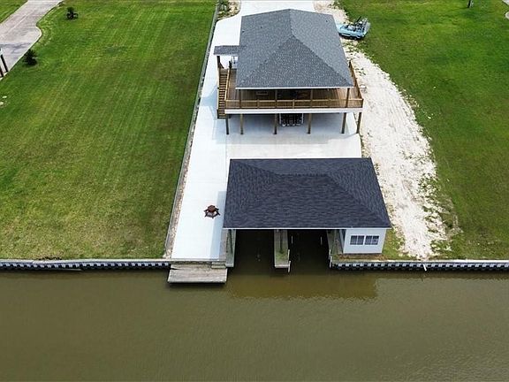 Waterfront Construction in Hackberry, LA. Nothing was spared in the design and build of this open floor plan waterfront home. There is even a cargo elevator for lifting your groceries and belongings upstairs. Inside there are 3 large bedrooms and 3 full baths. The living, dining, and kitchen areas have unobstructed views of the water. The home is built with entertainment in mind. The kitchen has one sink against the wall and another in the large island wrapped with bar stools. There is also a wet bar running the entire length of the living area. Just outside the home is a huge covered porch over the water. Enjoy grilling and entertaining, watching sunrises, and sunsets from this large covered porch. Under the house is a large storage room with plumbing in place for a bathroom. Entering and exiting the home is convenient with two sets of stairs, one coming from the driveway and the other going toward the water. Along the waterfront there is an enormous 1,450 square foot boat house. There are two large boat stalls, almost 200 square feet of air conditioned storage, and a screened room with a fish cleaning table. Enjoy the low maintenance and convenience of parking vehicles and boat trailers as most of the lot is concrete.