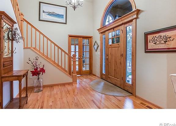 Stunning executive remodeled home tucked away in the tall Ponderosa Pines and Blue Spruces of Pinewood Knolls on 4.60 ac. A unique combination of outdoor living spaces and privacy. Multiple irrigated gardens, stepping stone walkways, professionally landscaped. Timber tech decking, covered deck and patio with built in fire pit! Interior has main floor master & master bath, hardwood flooring throughout, large unfinished walkout basement, wood casement windows and bay windows. Vaulted ceilings and skylights. Granite counters in the kitchen with ss appliances. Central air conditioning. Home office or den and loft with built in bookshelves. Huge 800 sq.ft. outbuilding with garage door! Easy commute to South Denver, I-25 and C/E470!