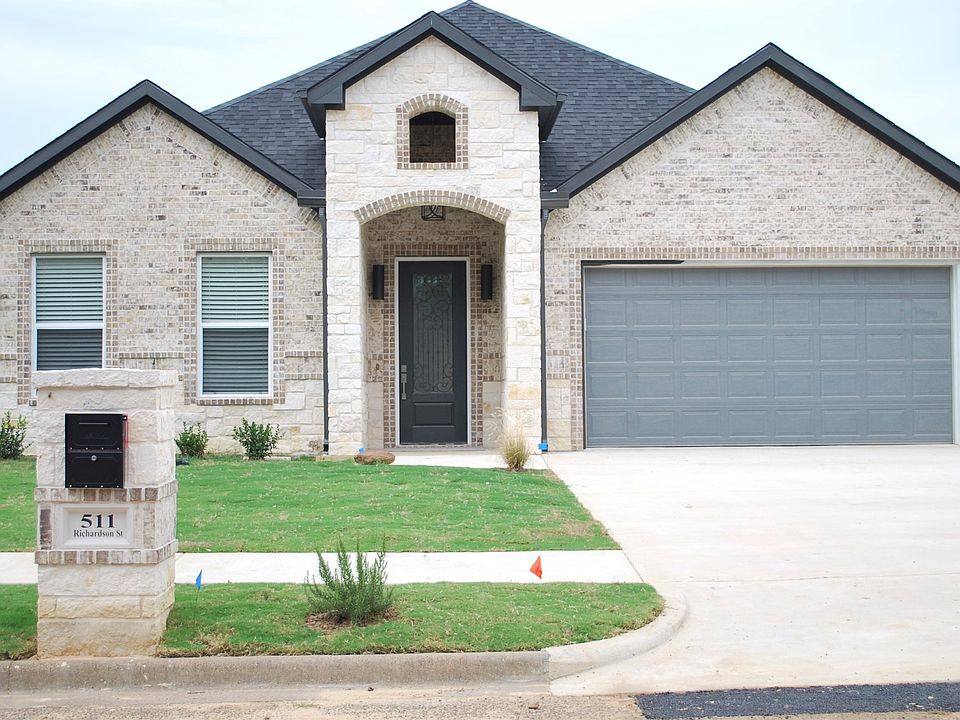 The exterior showcases a striking brick-and-stone finish, durable 30-year shingles, and 5-inch gutters. The yard comes complete with fresh sod, shrubs, young trees, and a brand-new privacy fence enclosing the backyard.