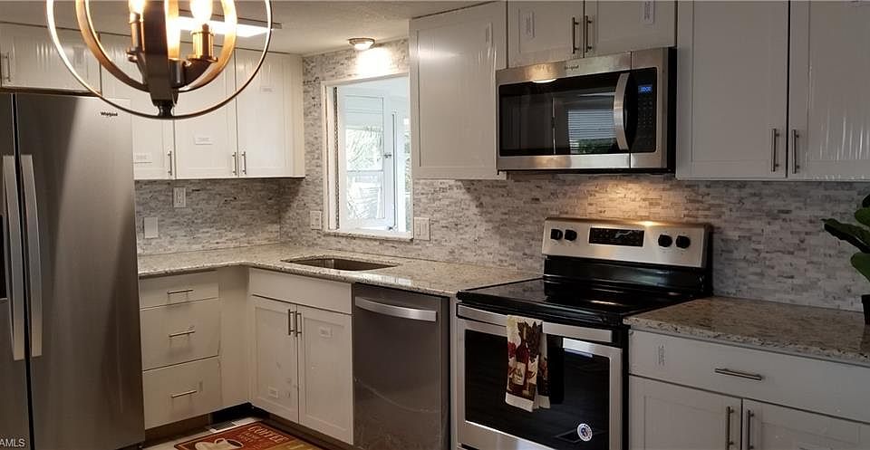Not a Coop or Land Lease. You own the land with low HOA fees. Beautifully updated manufactured home in Riviera Colony close to Downtown Naples. Home Makeover nearly complete. All new vinyl plank flooring throughout, new granite, new appliances, lighting and fans. This home is bright and clean. Home has one large bedroom, one small bedroom, 2 full bathrooms, a large kitchen, large living/dining room, and an enclosed porch. There is also a small covered porch, carport, utility/storage room, and patio. The subdivision does not allow owner to rent the home until he/she has owned it at least 2 years and has lived in the home. Very Active 55+ community. New A/C unit. CASH OR PRIVATE FINANCING ONLY. NOT ELIGIBLE FOR FINANCING.
