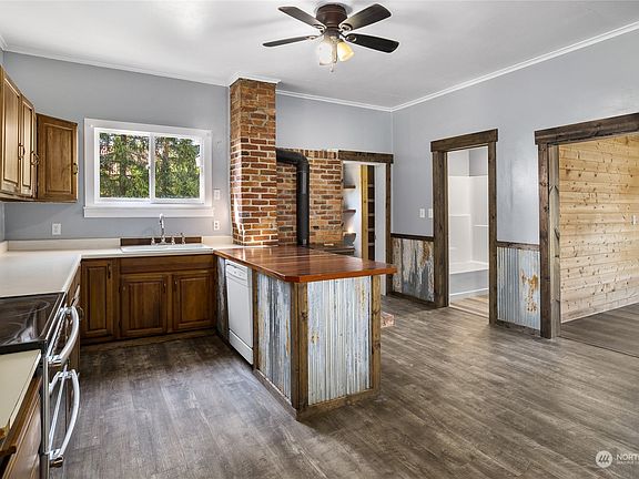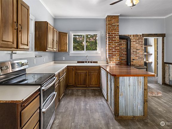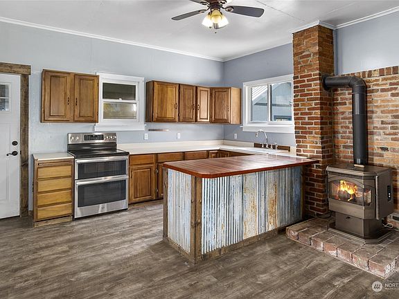 This home sits on a level lot in the historic "Ducktown" area of Roslyn. Cute covered porch for snow boots or lake toys. Main floor features a very charming kitchen w/repurposed metal wrapped island & wood countertop. Cozy pellet stove & exposed original brick! Big dining rm accesses the back yard. Living Space has pine floors & high ceilings. Primary bdrm w/original fir floors, double closets, & those gorgeous old bead board ceilings. 1 nicely updated full bath, a utility rm, & bonus space (mudroom or office?) Upstairs is a big bdrm, & a large loft too! HUGE lot at almost 19,000sf houses a 1 car garage, (with wood floors & elec. door) but could have potential space for a new shop too! Fully fenced yard with chicken coop & fruit trees!