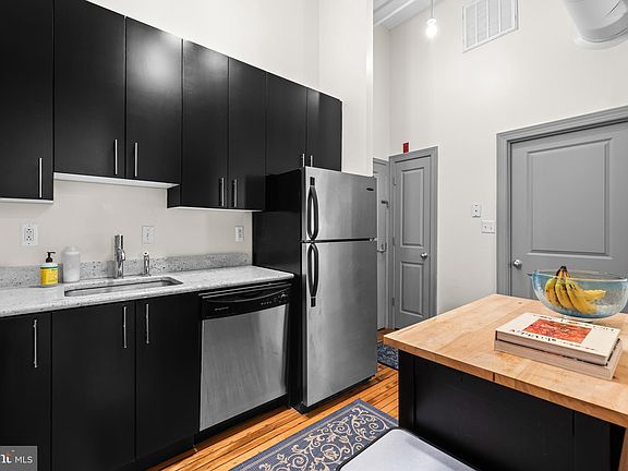Discover this stunning one-bed, one-bath condo in Fells Point, set within a beautifully renovated schoolhouse featuring Romanesque-style architecture! This gem boasts a modern kitchen with stainless steel appliances, granite countertops, and 42" mocha cabinetry. The original hardwood floors have been meticulously refinished, and the soaring 10+ foot ceilings create an airy feel. The spacious primary bedroom includes a large walk-in closet, while the bathroom features elegant ceramic tiling. Off the kitchen, you’ll find a sizable walk-in storage room with a washer and dryer replaced in 2019 and a water heater in 2022. Additional updates include a new HVAC system (2018) and ceiling fans in the living room and bedroom (2022). Enjoy vaulted ceilings, dramatic oversized windows with abundant natural light, and a private outdoor patio space. Just two blocks from the waterfront and within walking distance to Harbor East, this home offers the best city living with easy access to all the neighborhood's top amenities!