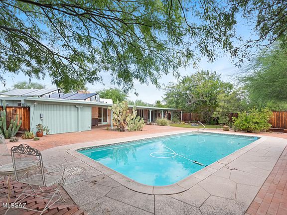 Tranquility as you look over the remarkably landscaped private back yard with the pool. The home reflects the best of Midcentury Modern with a tastefully updated kitchen a cook will savor. Join the primary bedroom and the contiguous second bedroom into a sitting room and a sleeping room. The Arizona room off the primary makes it easy to relax in the outdoors. No sliding doors and large covered patio. The owned solar system makes the end of the month much better! Large workshop accommodates numerous options. This location is premium. Classic Wilshire Heights is impeccably maintained and drives the desirability. Blocks from Park Place mall and all sorts of restaurants and shops in a small radius. Invest the time for a walkthrough and you'll be glad you did.