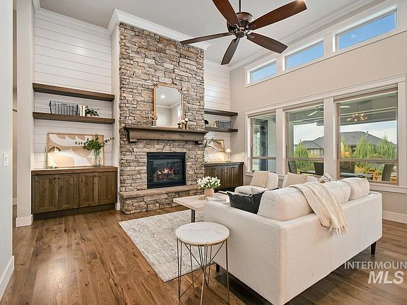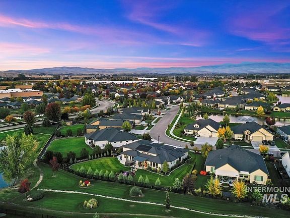 This remarkable custom-built residence offers a plethora of coveted features to live a life of luxury. It boasts extensive hardwood flooring, custom cabinets, top-of-the-line appliances that include a Thermador 6 burner range. Generously sized covered patio with tongue and groove cedar ceilings. Easily accessible patio from both the great room and the master suite while overlooking one of many community ponds. A nearby walking path leads to the Boise River. The master suite is a true retreat, featuring a spa-like bathroom complete with a spacious walk-in tiled shower and a luxurious soaker tub. The open great room is enhanced by a stunning stone fireplace with custom built-ins, wired for a 5:1 surround sound system. The property showcases lavish landscaping upgrades including a gorgeous stone waterfall and stream, full solar panel system, heated 4 car RV garage with epoxy-coated flooring, discreet screen doors, and more. Situated on a large lot and quiet cul-de-sac in the prestigious Heron River Preserve.
