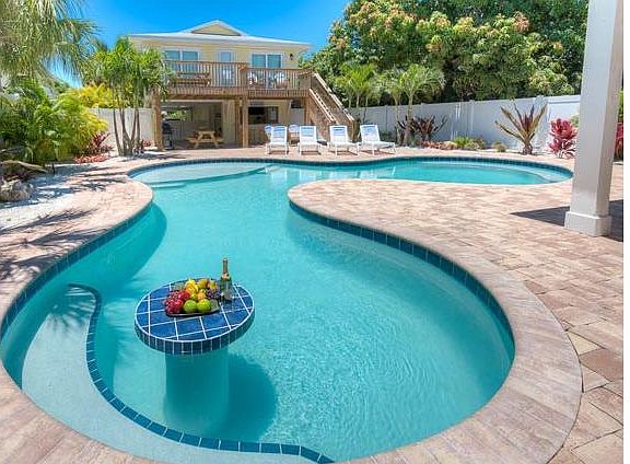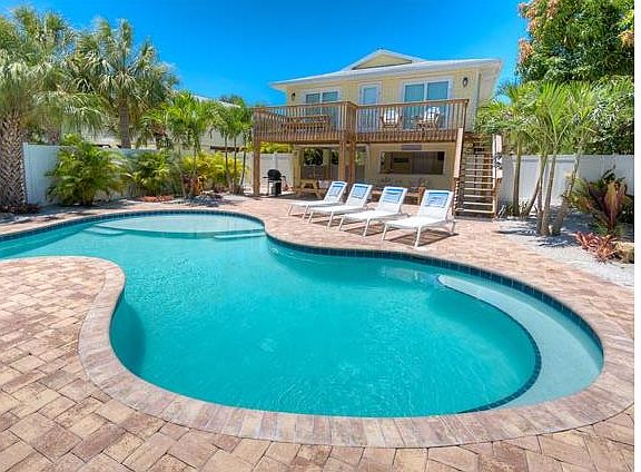 Cabana Breeze is a newly and completely renovated 4 bedroom 2 bathroom solar home on a oversized lot with multiple outdoor living areas and a brand new custom pool and cabana. This gorgeous home is located on the prestigious north end of Anna Maria Island, down the street from the City Pier, popular Pine Avenue shopping and close to the beaches. This house would make an excellent primary residence, vacation home, or a profitable rental property. Featuring brand new stainless steel appliances, granite counter tops in kitchen and bathrooms, new hand scraped hickory wood floors, crown molding, tongue and grove ceilings and walls, custom wood trim and doors, custom closet systems, energy-efficient LED lighting throughout, inside laundry room with new washer and dryer, new upstairs deck overlooking the pool, multiple outdoor living areas with bar, LED lighting, wood ceilings, etc etc etc. The brand new, large, custom heated pool offers a shallow water sun shelf, in-pool dining table with in water seating, and other unique features. There is a brand new outdoor poolside cabana with metal roof. In addition to the cabana, there is a large outdoor pool-side living area/recreation room with an granite bar, shaded sitting areas. The private enclosed outdoor shower is great for rinsing off after a day at the beach (which is just a short walk away). This house is currently in a successful rental program, with significant future rental income.