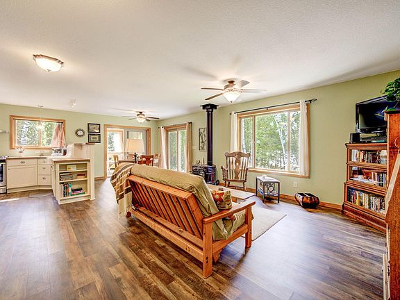 Get ready for your up north get-away nestled on 6.7 private acres & 213' of level lake frontage! This must-see year-round home will capture you with the view when you walk into the open kitchen/dining/living room overlooking the beautiful backyard flower beds & wonderful lakeside view. With attention to detail & a layout that was designed for space efficiency, this farm style 2 BR/1 BA custom built one level home features an open kitchen with plenty of ivory cabinets, newer appliances, a separate laundry room and mudroom, dining area walking out to the patio, and sweet bath w/claw foot tub & separate shower. Relax with your morning coffee in the bright sunroom (that could be used for additional sleeping space) or enjoy the lakeside view in the living room with additional heat of a wood burning stove. Store all your toys with an abundance of storage with a 2-car attached garage & huge 60x40 shed. With gorgeous sunset views, level elevation, sandy bottom - enjoy your best lake life!