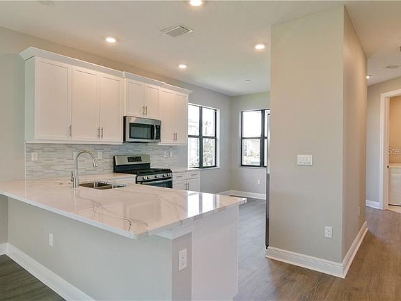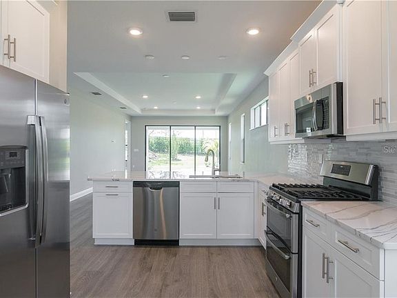 Cambria quartz countertops with breakfast bar, white Kitchen Craft cabinetry and a Casual Dining nook complete the Kitchen. Main Living space offers coffered ceilings and laminate wood flooring throughout. Covered Lanai offers space to enjoy the outdoors.