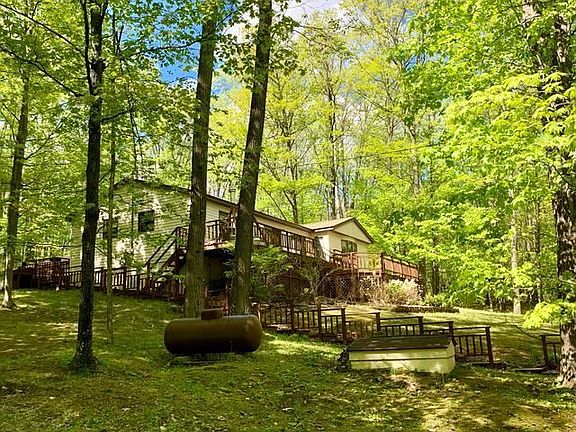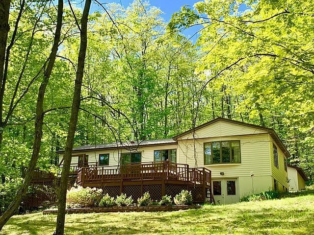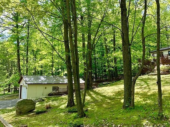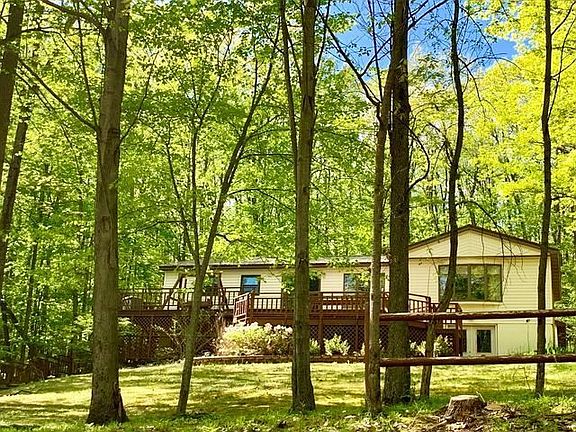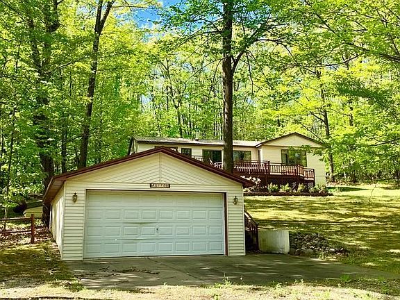 Beautiful Blue Lake Estates! Private Lake Association offers; 4 commons/access sites, 2 boat dock areas and a gorgeous, sandy beach area with a park across the road. Located in a remote area for nature lovers and those looking for serenity. This ranch home has over 1730 sq. ft. with spacious room and soaring ceilings. Featuring a Finnish wood fired Sauna, Central Air, two garages and metal roofing on all buildings. All of this and more situated on almost 2 wooded acres centrally located in a fabulous FOUR SEASONS AREA!!!