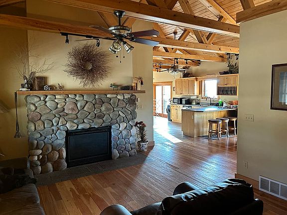 Home is a four bedroom 3 bath rancher with a daylight basement. single car attached garage. Two year old Hot Springs Hot tub. Fully finished Detached 30/40 insulated shop with bathroom on its own cistern and septic. It has a Blaze king stove. There are 2 carports and a large barn. There is also a finished cabin on the property with newly installed power box ready to hook up. Beautifully manicured property, one of a kind