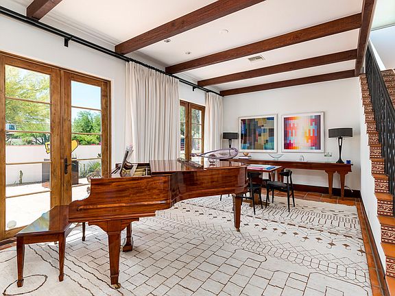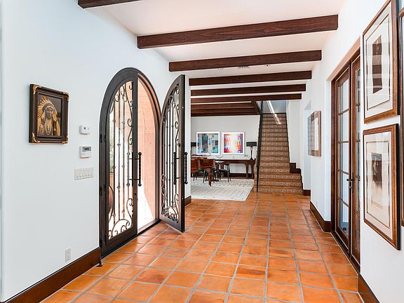 This unique custom Santa Barbara/Transitional home was thoughtfully designed to combine comfortable easy indoor/outdoor living with the ease of entertaining both intimate and large affairs. The main home boasts a huge master suite, his and her offices, gourmet kitchen, warm family room, serene sitting room and so much more! The backyard includes a sparkling pool, spa, built in BBQ, fire pit, pizza oven, large grassy area, sport court, gorgeous gardens, citrus trees all topped off by incredible mountain views.