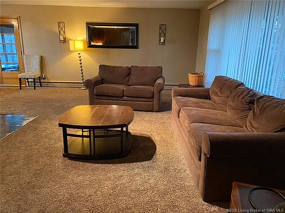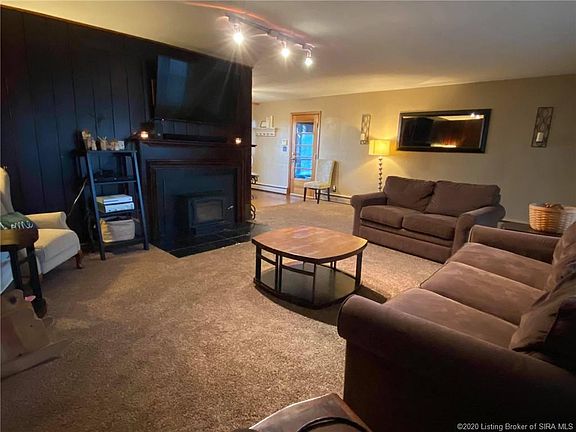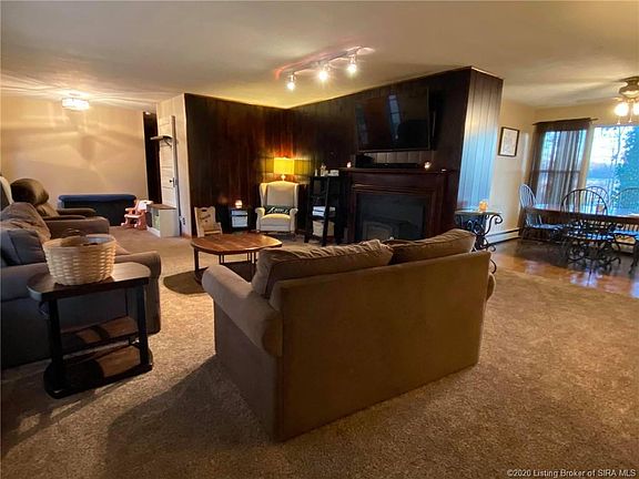 Beautiful country home! Views of a natural slate bottom creek, Nestled back in the quietness of the woods on 3 shaded acres, you'll find 3 bedrooms, 2 baths, partial finished basement and is a scenic find. Enter through the foyer of hardwood floors to the carpeted living room with gas fireplace, lots of big huge newer windows, around the corner is the large kitchen, lots of cabinets and counter space, newer counter tops. Family Room in basement also has gas fireplace lots of storage. There is a sunroom with newer windows so you can use all year. back yard wood deck, has a hot tub that could possibly be repaired, perennial flower garden, Attached 2 car garage, a 2 car car port, and detached one car carport garage. Also has pull off for parking your RV, with electric to plug in. Mature trees, paved drive. Lots of wildlife. Only minutes in either direction to Scottsburg or Hanover.