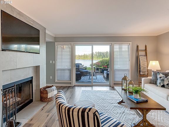 Discover the epitome of sophisticated living in this exquisite 1003 sq ft Heron Pointe Condominium, located in the highly sought-after Johns Landing neighborhood of South Portland. This two-bedroom, two-bathroom residence offers an elegant open floorplan that seamlessly integrates space and light, providing a harmonious and inviting atmosphere.At the heart of this residence, the great room boasts a cozy fireplace and incredible panoramic views of the Willamette River and majestic Mt. Saint Helens. This is a perfect space for hosting intimate gatherings or simply relaxing and admiring the breathtaking vistas.The adjacent gourmet kitchen is a culinary enthusiast's dream, with quartz countertops and modern stainless steel appliances. The timeless charm of wood laminate flooring throughout the condo adds warmth and class.Step outside to your partially covered ground-level patio, your front-row seat to nature's grandeur. Start your day with the soothing rhythm of the river or wind down in the evening under the stars.In this prime location, you're mere minutes away from Johns Landing's vibrant array of restaurants and shopping. Enjoy the best of Portland's dining scene and retail therapy right at your doorstep.The primary bedroom features a stylish barn door that adds a touch of modern elegance. The second bedroom offers flexibility and style with a convenient Murphy bed, allowing the space to be used as a guest room or a home office as needed.Retreat to the luxurious bathrooms featuring quartz countertops and contemporary fixtures that provide a modern touch.The condo has two assigned parking spots, including one that is covered, eliminating any parking worries.This Heron Pointe Condo offers an unrivaled lifestyle, blending comfort, style and a prime location. Here, city convenience meets nature's beauty, creating a unique living experience. Don't miss this opportunity to make this dream home yours. Come join us for a tour today!