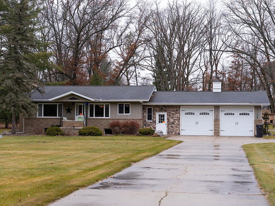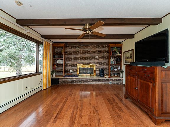 Located on the south side of Lake George, this beautiful and well-built 2-bedroom ranch sits on 8.57 acres and offers an exceptional blend of comfort, craftsmanship, and outdoor amenities. The two-car attached garage offers a work bench area, natural gas heater, and tall doors to accommodate bigger vehicles, and connects to the home through a climate controlled breezeway for convenience year-round. Inside, the main floor features 5-inch plank hickory flooring throughout the kitchen, dining, and living room. Enjoy the warmth and charm of two fireplaces, one on the main level and one in the basement. The partially finished basement includes a spacious family room with a built-in bar and bathroom, with plenty of room to expand with additional finished spaces. Efficient comfort is provided by multi-zone hot water boiler baseboard heat, paired with a newer central air conditioning system. Outdoors, the property shines with a new, painted oak fence surrounding the entire parcel, a 6-inch concrete driveway, tall garage doors, fenced pastures, a 1-acre irrigated garden area, and lawn irrigation. The irrigation system is currently disconnected due to the water source being located on a split parcel, but can be restored with the installation of a new well. A highlight of the acreage is the 1-acre stocked pond, recently deepened and equipped with electricity for an aerator or other accessories. It’s stocked with walleye, hybrid bluegill, and perch. Perfect for recreation and relaxation. Whether you're looking for the perfect hobby farm, space to entertain, or just relax and unwind, this property is calling you home!