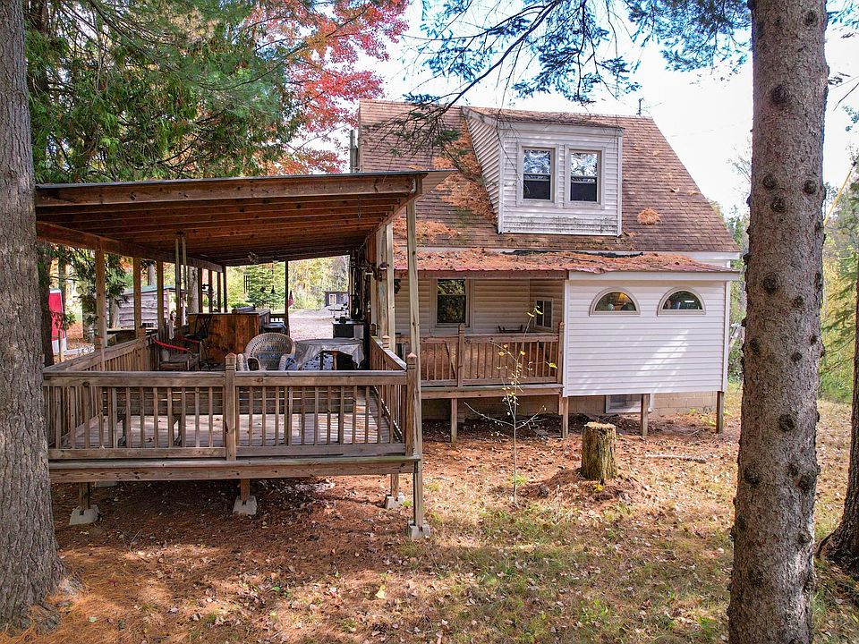 Up north Getaway! This house features a 5.5 acre property which borders a creek with the entire south property line. Parts of the creek are about 3ft wide and becomes pretty large come the spring melt. Enjoy your view under the massive roof covered deck! This property also has four different out buildings. A two car garage, a pole barn, shed, and a chicken coop. There is two deer blinds as well.