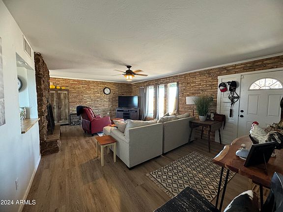 Beautiful updated 3B 2B home on an acre in the quite Harquahala Valley. The most gorgeous mountain views. A horse lovers paradise complete with 8 horse pens with shades. 30 amp RV hookup for guest. 220 V hot tub hook up. You can ride out for miles. The home has a unique two way fireplace between the living room and the dining room. The kitchen boast a breakfast bar, wood sealed countertops, new appliances, reverse osmosis and a pantry. New flooring throughout home. Updated bathrooms with a glass/tile shower. Big laundry room with exit door. Three good sized bedrooms with walk in closets. Private well with new 3,000 gallon storage tank. New roof/AC. Bacteria guard salt free three stage filtration system. If you want to live out of town this is a must see home that is priced to sell quick!