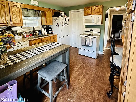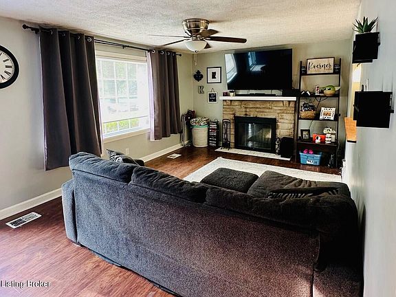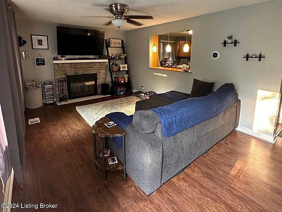 Welcome to 5111 Fey's Court, a cozy Bedford stone ranch located on a quiet dead-end street. The living room features a large picture window, wood-burning fireplace and wood flooring that extends throughout the kitchen, laundry room and hallway. The eat-in kitchen is furnished with an eating bar, pendant lighting, neutral countertops, and a tile backsplash. Adjacent to the kitchen is the laundry room equipped with a custom built-in storage cabinet offering additional counter space and a front loading washer and dryer that will remain. Bedrooms feature remote controlled ceiling fans and new carpeting. The bathroom features tile flooring, and a vanity with a vessel sink. Fully fenced, large backyard with a patio, fire pit, and hot tub area.