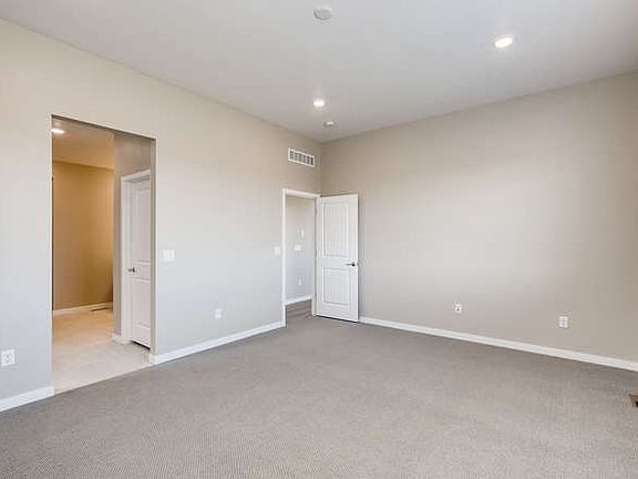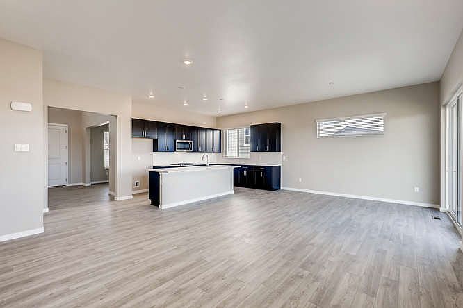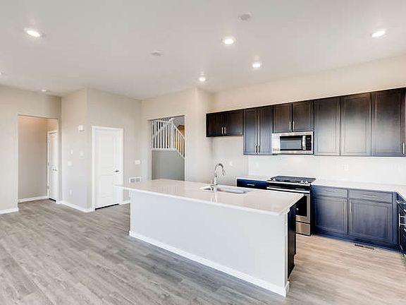 Two story home with main floor master on a lot that backs to open space. Open floorplan with covered extended deck, walk-out basement and fireplace in great room. Solid surface flooring on main level with upgraded carpet in bedrooms and Quartz countertops. Window coverings on first and second floor are included. HOA covers front yard lawn care in summer and snow removal in winter. Amenities include rec center, pool, trails, 12 acre park and 90 acre lake.