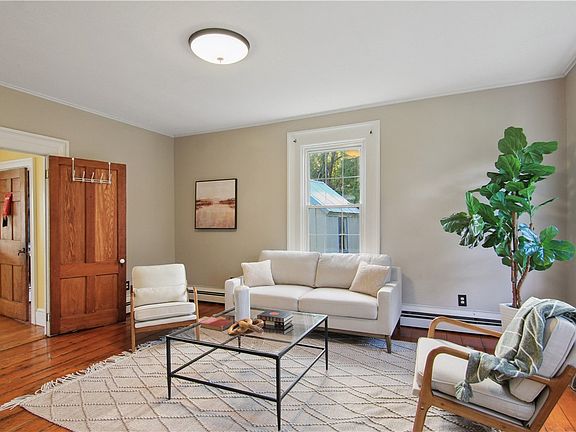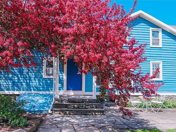 The dreamiest homestead minutes away from everything and entirely hidden from the road. Drive under a canopy of lilac trees up to this stately colonial built by Aaron K. Owen. The country driveway leads you to a custom stone patio and quaint porches overlooking the grounds. Inside is an entirely versatile layout, able to fit any need. Hardwood floors throughout, many original, and no shortage of huge windows to let in ample sunshine and grassy views. Cathedral ceilings, exposed hand-hewn beams, and little details everywhere fill this home with charm. On the main floor is a primary bedroom with private porch and a full bathroom with jacuzzi tub and new walk-in shower. Large and bright kitchen that opens up to a second secluded patio. The formal entryway leads upstairs to two more bedrooms plus a third with a second kitchen, attached bathroom, and hidden loft offering flexible renting opportunities. Outside find a brick smokehouse, chicken coop, animal fencing, abundant varieties of fruit, gardens, two story shed, workshop, and a large stocked pond with a dock. A picturesque property with everything you could possibly need.