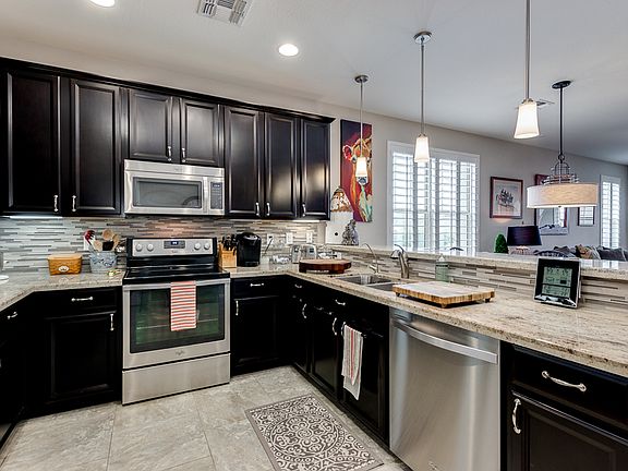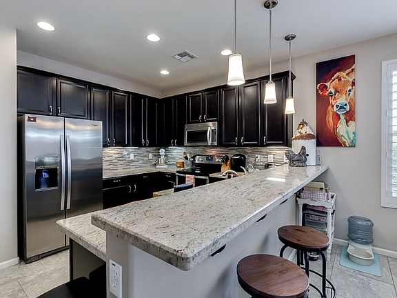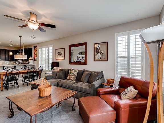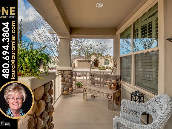 Look no further! This SINGLE-LEVEL home has it all! 4 Bedrooms + 3 Baths including DUAL MASTERS! Quality 2x6 Construction + 8-foot interior doors & Plantation Shutters! Gourmet kitchen with bar top seating, stainless appliances, 42-inch cabinets, upgraded lighting, granite counters, glass tile backsplash! 20-inch TILE throughout living areas! Split floor plan-guest bedroom up-front with Private Bath! Oversized family room with surround sound pre-wire! Ceiling fans throughout! Backyard is fully landscaped with grass, gas stub for BBQ + covered patio! Why wait for a new-build in Eastmark? Move-in now! Eastmark Community features acres of park, splash pad, Community Pool, Rec Room, A-rated Schools, Close to 202 freeway & nearby Shopping. Call for an appointment today!