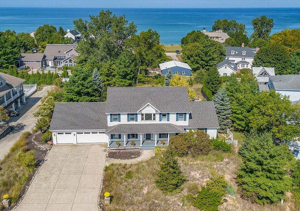 Completely renovated down to the studs, the home captures the essence of relaxed lakeside living with warm, inviting interiors and multiple spaces designed for both entertaining and quiet escape. The main-level primary suite features private deck access and direct entry to the pool, creating a seamless indoor-outdoor experience. From several rooms throughout the home, you'll enjoy views of Lake Michigan, adding to the tranquil ambiance and connection to the shoreline.