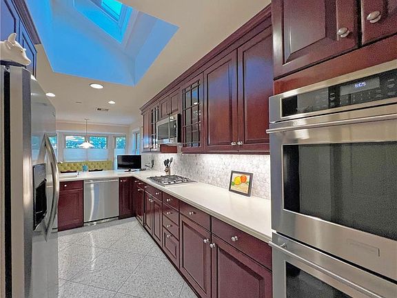 The gourmet kitchen is a chef's dream, featuring GE Monogram appliances, a butler's pantry, porcelain tile, Corian counters, updated backsplash and custom Woodmode/Brookhaven solid wood cabinetry. Tons of natural light through the skylight with operation window & sunshade. <BR> <BR>