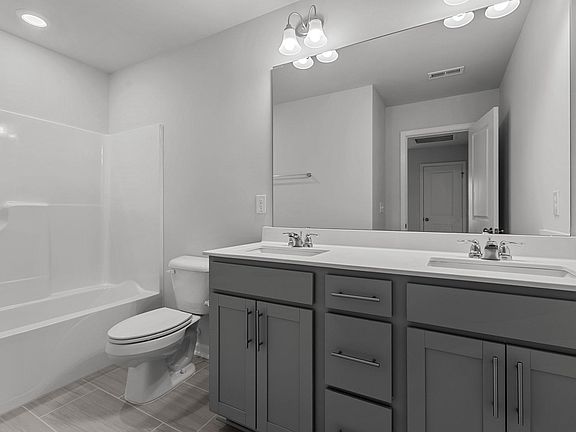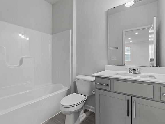 Second-floor master suite boasts dual walk-in closets and a spa-like bath with dual vanity and tiled shower