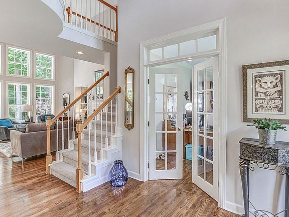 Stunning-updated 4 Bed w/bonus -enter to gleaming hardwds main level- open floorpln w/ 2 Story foyer & living, wall windows back of home w/a view! Entertain frm Gourmet Kitchen w/loads cabnts, new prem applncs, new granite, tile bs, pantry, cntrbar seatng. Formal dng w/wainscot, crown, Office w/french drs. Upstairs find lg master, w/ensuite spa bath, double vanity, grdn tub & W/I. 3 more beds up w/bonus. Lndry Rm w/cabinets. Lg flat .46 acre tree lined lot w/dbl deck. Ovrsd 2 Car w/storage flex space.