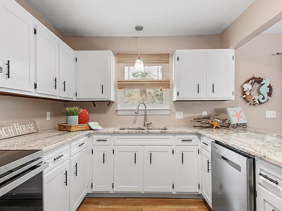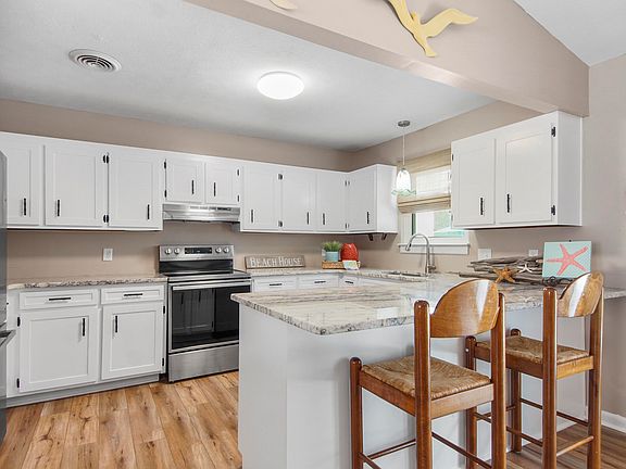 Inside, this home exudes coastal charm with luxury vinyl plank wood-look flooring throughout and freshly painted walls that bring a bright, welcoming feel. The kitchen and bathroom both feature beautiful granite countertops, and the bathroom showcases a walk-in tile shower with new plumbing. Accessibility is seamlessly incorporated with widened doorways in the master bedroom, making this retreat welcoming for everyone.