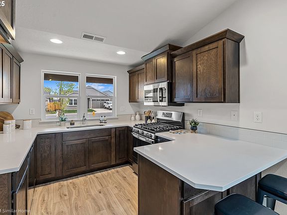 The Clearwater plan features vaulted ceilings in the dining and living rooms. The kitchen, at the front, offers ample counter and cupboard space. The main suite features two closets and an ensuite with dual vanity. The two other bedrooms share a sizable second bathroom. This home includes a one-year warranty and a landscaped front and backyard with sprinklers a covered patio, air conditioning, granite kitchen counter, lvp throughout the main living areas. SS appliances include, stove, dishwasher and microwave. Woodland Ridge Community offers beautiful mountain views, close proximity to freeway entrance, grocery stores, outdoor recreational areas. Pictures are of like homes. Estimated home completion August/September