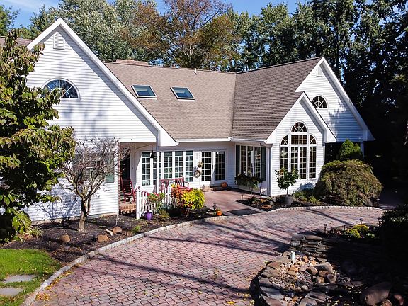 Fantastic opportunity to own this magnificent ,one of a kind, custom built home situated on just under 3 acres of beautifully landscaped grounds. As you drive up to this estate you will immediately be impressed by the circular brick driveway , fenced yard with pond and gorgeous 3+ car detached barn style garage. Once inside the home you will continue to be inspired by the attention to detail you find. Hardwood floors, 6-panel solid wood doors, wainscoting and an abundance of natural light grace this home. The center living room with its cathedral ceiling and skylights features an eye catching stone fireplace offset on either side by french doors leading to one of this homes two sunrooms . A well planned out kitchen provides an abundance of storage with custom cabinetry, a breakfast nook, separate formal dining room and the second sunroom, open to the kitchen, with heated slate flooring for chilly winter days. Three spacious bedrooms, a laundry/utility room with outside access and 1.5 baths round out this level.. Move on up to the left side second level and here you will find the master suite with separate sitting/exercise area, extra large walk in closet and master bath. The right side second level accessible via the circular staircase off of the breakfast nook is a unique space created by this owner to display his passion for "Monday Night Football" and other social gatherings, and is accented by the handcrafted custom bar and a gaming area. An additional 1/2 bath is also located on this level. Outside is the detached garage with heat, AC and water as well as an extra large pole barn also with electric. With its highly rated schools, close proximity to Philadelphia, New York and the Jersey Shore as well as its convenient location to stores, shops and restaurants, its not wonder Mt. Laurel has been rated one of the best towns in New Jersey to live and is just one more reason you'll want to make 5112 Church Rd. your home.
