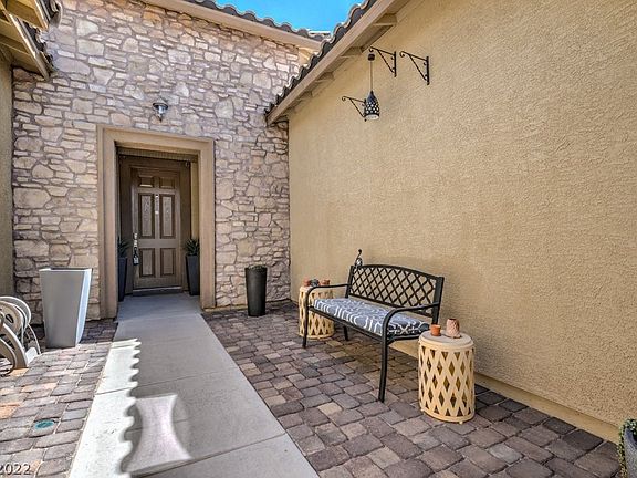 Gated courtyard, soaring ceilings, open kitchen, & swim spa off covered patio! Kitchen offers oversized island w/breakfast bar, dining area w/large windows, pantry, custom splash, corian tops, & tile flooring. Great room has surround sound, fireplace, wine fridge, built-ins, powder room, & looks to gorgeous backyard and patio. Primary suite has been redone with wood-grain flooring, sunken tub, walk-in shower with beautiful stone accent, & dual sinks. Also has sitting nook, accent windows, two walk-in closets, & separate from other bedrooms. Two guest rooms (w/shared full bath) down long hallway w/built-in cabinets. Tall slider to extended covered patio, grass lawn, extended slab for covered swim spa area, gated side yard, irrigation/sprinkler system w/timer, & backs to parkway. Utility room offers built-ins, 3-car garage (tandem 3rd), fully-fenced backyard, smart locks w/keypad, & lot situated at end of cul-de-sac. Mtn Falls has 18-hole golf, pools, clubhouse w/lounge, & 45min to LV!
