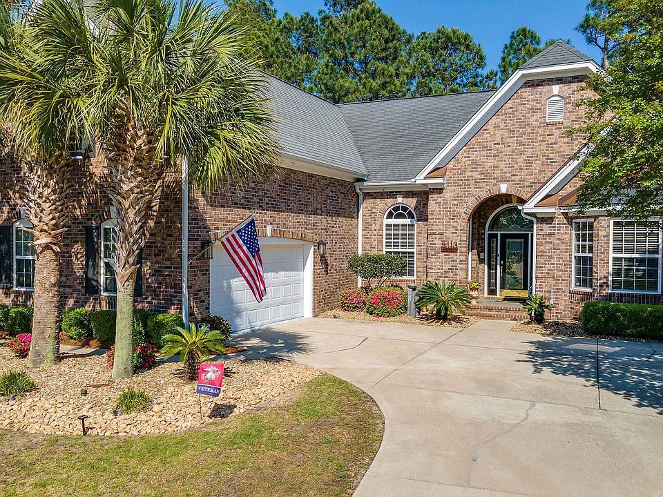Golf course living at its best. Stunning all brick custom home with open concept floor plan on the signature par 3 13th hole of the Parkland course. Three of the four bedrooms are on the first floor, making this an easy living style for many. The open floor plan with full dining room, kitchen with 2 station breakfast bars, under counter wine ref. and ice maker, full eat in area and open access to large living room with gas fireplace makes it a great entertainment environment. Enjoy your front to back view from the front door through to the open living room and your all-season sunroom and screened lanai. High quality engineered hardwood floors throughout, updated bathrooms with porcelain flooring, blue Azura counters, lights and fixtures makes this home ready to move in today. Master bedroom has room for your office desk, or sitting area to enjoy outside views, as well as a custom closet system. In addition to the two additional spacious downstairs bedrooms with double wide closets, upstairs you have a 2-room suite, with full bath that can be used for a workout room, office, and 4th bedroom. Outside you have mature plantings, multi-level deck with 5/6-person low maintenance hot tub and views everywhere you look! Backyard is fenced, with pet access from sunroom and screened lanai. Garage includes ceiling rack storage added. Some recent improvements include new roof, kitchen countertops, screend lanai, interior painting 2022-2023. You are also located near the owner’s clubhouse with pool, tennis, basketball, bocci ball, and meeting spaces. There are three golf courses onsite, two offsite, and different levels of membership available. Close to all that Myrtle Beach has to offer, restaurants, beaches, shopping, medical facilities, and more.