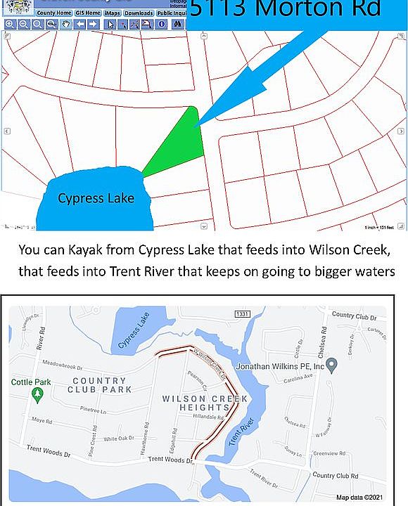 5113 Morton Rd, New Bern, NC 28562 Lot # 10 Lakeview Estates Craven County. This is a corner lot that has a small waterfront section. $79,900. The small part of the triangle gives you water access to the lake. The lot sits up high and has a beautiful view looking down the length of Cypress Lake. Imagine early morning coffee in hand as you are standing on your back deck, 6 feet above ground level as close to the water as the building design works, the sun is just coming up, the mullet are jumping in the lake (they really do) and you have the most amazing view of the full length of the lake. After you finish your coffee, your plan is to launch your kayak and paddle across the lake over to Wilsons creek entrance on the other side of the lake and follow it through the Trent Woods subdivision and out into the Trent River and over to have breakfast at one of the waterfront hotels in downtown New Bern Owner financing is available The price is firm, we just listed at our lowest price upfront instead of listing high and haggling down. We will split the Atty fee for closing, no realtor fees, etc. We pay our taxes and normal cost for sellers etc. If you would like owner financing we can do interest rate as follows: 10% down at 5% 5 to 15 years. 20% down at 4% 5 to 15 years. 30% down at 3% 5 to 15 years. 40% down at 2% 5 years. 50% or more down at 1 % 5 years. No Realtor calls to ask to get a general listing etc. If you have a serious client interested in the property, that has not already contacted us about it, we will pay a real estate fee of 2.5% to your company. You can send us by email or a secure document electronic form as you prefer a single person contract for a showing of the property with a maximum 2.5% realtor fee. Please do not contact us about listing the property. This is only if you have a buyer in hand whom you can name on the contract who may be interested.