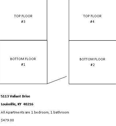 MOVE-IN TODAY! * 1 bedroom, 1 bathroom, apartment available at 5113 Valiant Drive, Louisville, KY 40216. This apartment is on the 1st floor. 680 square feet and the rent is $535.00/month. Rent includes all of the water, sewage & trash removal. (Use local laundry facility) Ready to view and move into today. Rent includes Water, Sewage & Trash