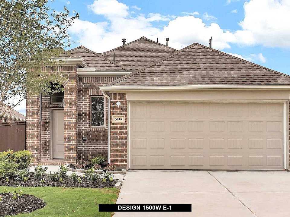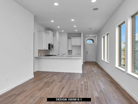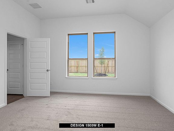 Entry leads to open kitchen, dining area and family room. Abundant natural light and 10-foot ceilings throughout. Kitchen features large walk-in pantry and generous island with built-in seating space. Family room features wall of windows. Primary suite includes bedroom with 10-foot ceiling. Double doors lead to primary bath with dual vanity, separate glass-enclosed shower and large walk-in closet. Secondary bedrooms feature walk-in closets. Covered backyard patio. Utility room leads to two-car garage.