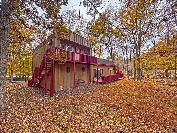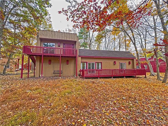 Updated 4-bedroom Contemporary Home in Penn Estates! The main floor OPEN CONCEPT boasts 10 FT ceilings and modern finishes to impress! Light bright and open, the living room features a tiled, wood-burning fireplace, kitchen bar seating, and sliders to the deck. FIRST Floor Master Bedroom Suite with full bath and sliders to the deck, plus SAUNA, and additional main floor bed and full bath. Upstairs features two large rooms with another full bath, and sliders to their own balcony, plus there is a new rooftop deck. Cul-de-sac location, large driveway parking, and 2-car attached garage. Walking distance to the community Clubhouse, pool, and basketball courts/ baseball field! Huge Vacation Rental potential, or a great Pocono getaway!