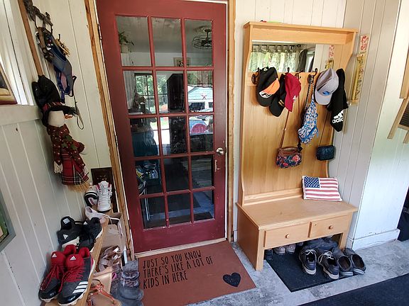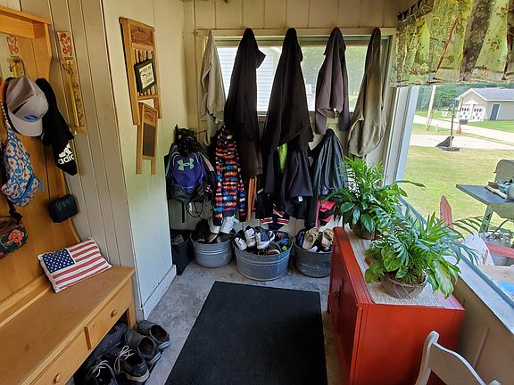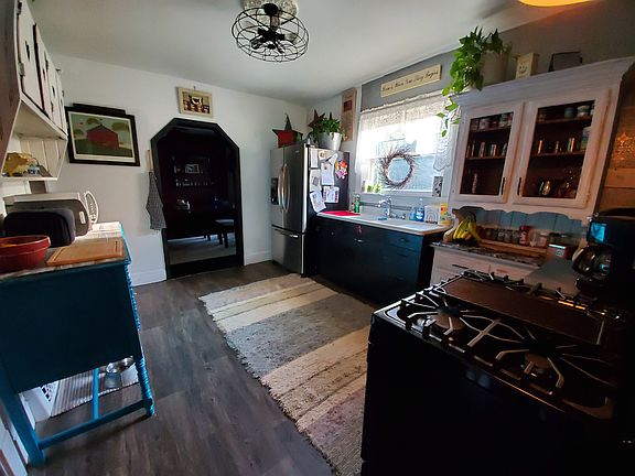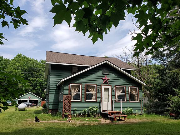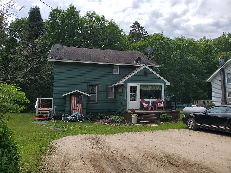 Large 4/5 bedroom home w/ original hardwood floors & trim, 1.5 baths, with detached - 2 car garage, sun porch, and an old dance floor & bar in the basement - would be beautiful refinished! Walk in linen closet upstairs. 3 porches lead to entryway/mudroom, a home salon (currently), and the sunroom. Propane/Wood Pellet Heat.