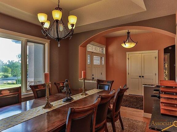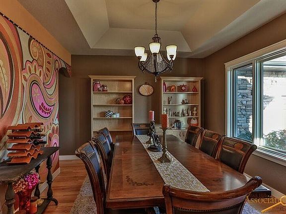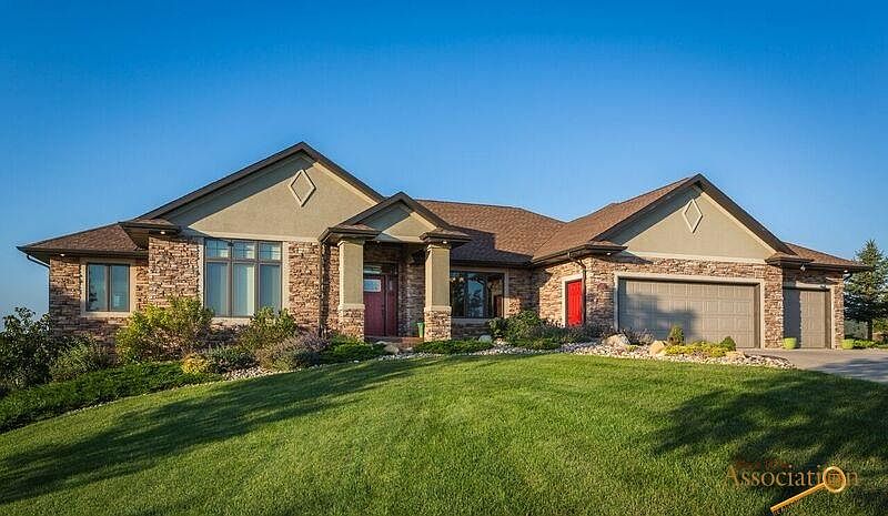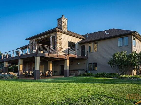 Listed by Stuart Martin, Re/Max Results 605-390-4227. One of the finest homes on one of the finest lots in Red Rock Estates. Enjoy views of the 18th fairway from your covered deck equipped with a wood fireplace and flat screen tv. Quality shows throughout in the Reyelts built home. The main floor offers a spacious living room with hardwood floors, gas fireplace and built-in shelving, formal dining room, sun room, laundry room with cabinets and sink, plus a custom kitchen with ample Maple cabinets, island, Corian countertops and Kenmore Elite stainless steel appliances. The main floor also features two bedrooms including the master suite with a custom tiled bathroom with double vanities, whirlpool tub, custom tiled shower and a walk-in closet. When you walk downstairs you will love the custom wet bar in the huge family room with doors to the covered patio. There is also a theater room and three more nicely sized bedrooms with built-in closet organizers and a bathroom. The 1.04 acre yard has been professionally landscaped with a sprinkler system. There is plenty of room for your toys in the 3 car garage plus there is built-in storage for your golf cart, lawn mowers, etc just off of the patio.