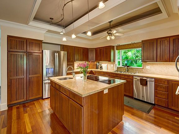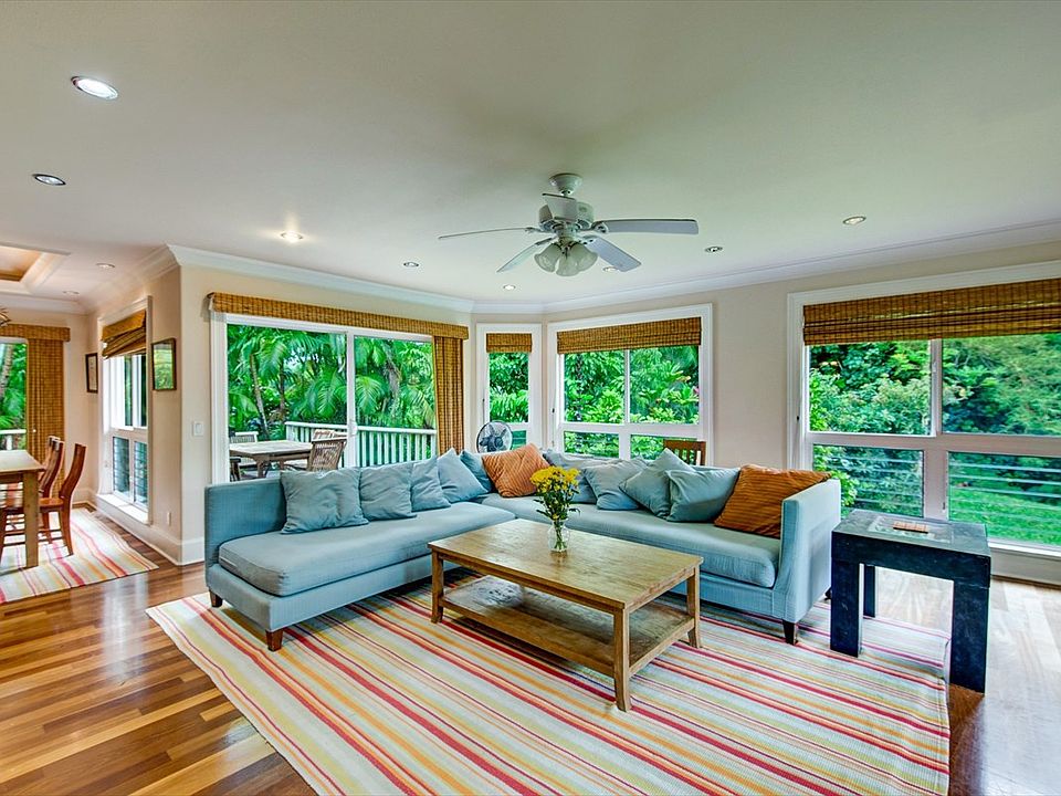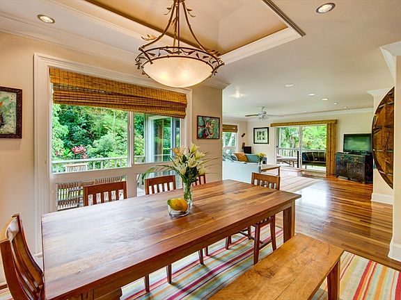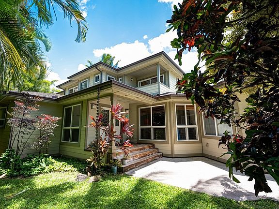 Located in the Heart of Hanalei at the end of a quiet cul-de-sac, this large 5-bedroom, 4.5-bath custom home with A/C is a Licensed Vacation Rental (TVR #5128) and a fantastic retreat designed to comfortably fit extended families. Custom craftsmanship throughout, the home features a large gourmet kitchen with free-standing island, 4 spacious lanais, 2 laundry areas, and an ample 2-car garage w/ built-in surf board racks. The large living/dining/kitchen area is great for family & friends. Situated on a quiet little side street that is tucked away, Papio Place gets very little traffic, making the cul-de-sac location ideal for small children. The home is located within an easy 5-minute stroll to the beach at Hanalei and is also within close proximity to stores, restaurants, farmer's markets, and fitness studios -- everything that Hanalei has to offer is close at hand!A small stream behind the house is great for kids -- for fishing, exploring, and catching prawns. The stream also lends a soothing air of ambiance to the large back lanai. Mountain and waterfall views are best seen from the upstairs master bedroom & junior master suites. Located w/in an IRS Opportunity Zone.Other notable features of the home include:* 2 Master Suites - Each w/ Private Covered Lanais* 2 Guest Bedrooms* A 5th "Lock-Out" Bedroom Suite w/ Private Bath, Wet-Bar & Separate Entrance (Great for Extended Family & Guests)* Air Conditioning* 3 Wet Bars* Brazilian Cherry Hardwood Floors* Wolf Ovens* Granite Counter Tops* Whirlpool Tub in Master Suite* Copper Rain Gutters* Stainless Hardware & Appliances* Crown Molding, Coffered Ceilings & Recessed Lighting* Custom Cabinetry* Great Airflow* Ipe DecksThis property has been an active and successful vacation rental for many years. Its quality and character put it in a class that is superior to many of the older homes that are currently on offer in Hanalei.