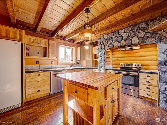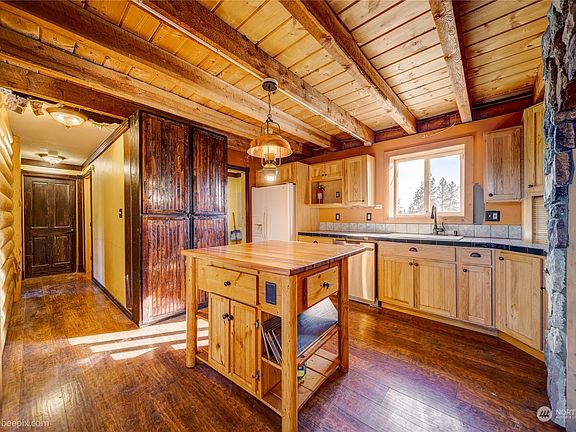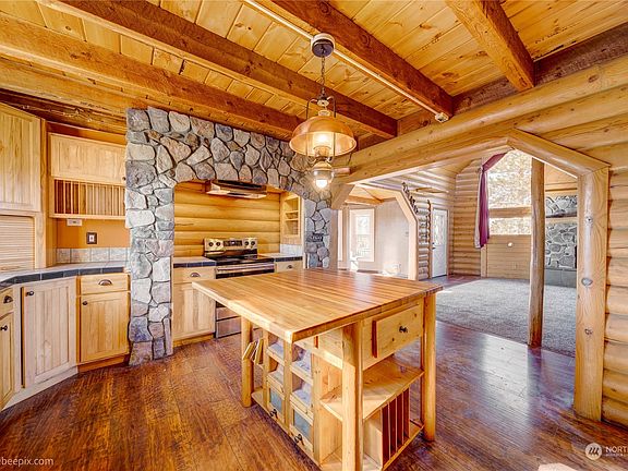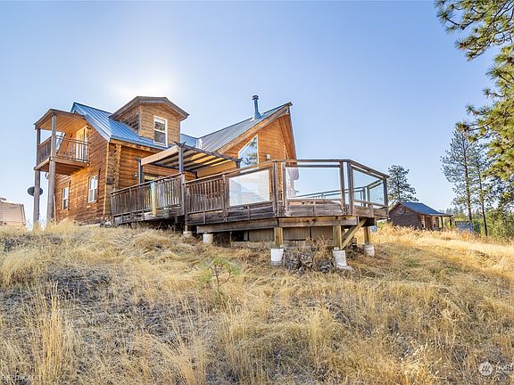 Beautiful log home on 20 acre lot. In a private and gated setting just 30 miles to Spokane. Custom built and remodeled with heated floor on main level. 3 bedrooms and 2 bathrooms plus additional loft space. Large master suite with oversized tub, dual sink. The huge kitchen as custom pantry, prep island and opens to great rooms. Deck wraps around the house with hot tub overlooking the private pond. There is a bunk house asa shop, plus additional space for RV