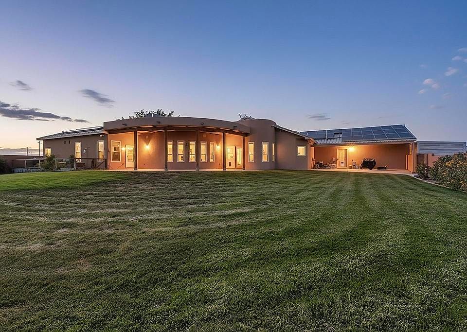The views at this luxury home will take your breath away! Beautiful beamed ceilings greet you as you enter this light filled house. Imagine entertaining in the chefs kitchen, and spending evenings on the covered patio watching the Sandia's turn pink. Features include Anderson windows (Jun.2025), a whole house water softener w/ RO system (2024), Metal roof, poured concrete floors, diamond plaster walls, vigas & nichos, alder cabinets, 1.22 acres, solar panels, attached 3 car garage + a separate workshop. The Workshop: Its 1600 sq ft., metal, has a 1/2 bathroom(cold water only), is insulated, has a hoist & compressor. There are 3 bays & lots of outside storage space for all your toys. 2 RV electric hook ups. It has its own private well too! Full of love, this home is ready for its new owner